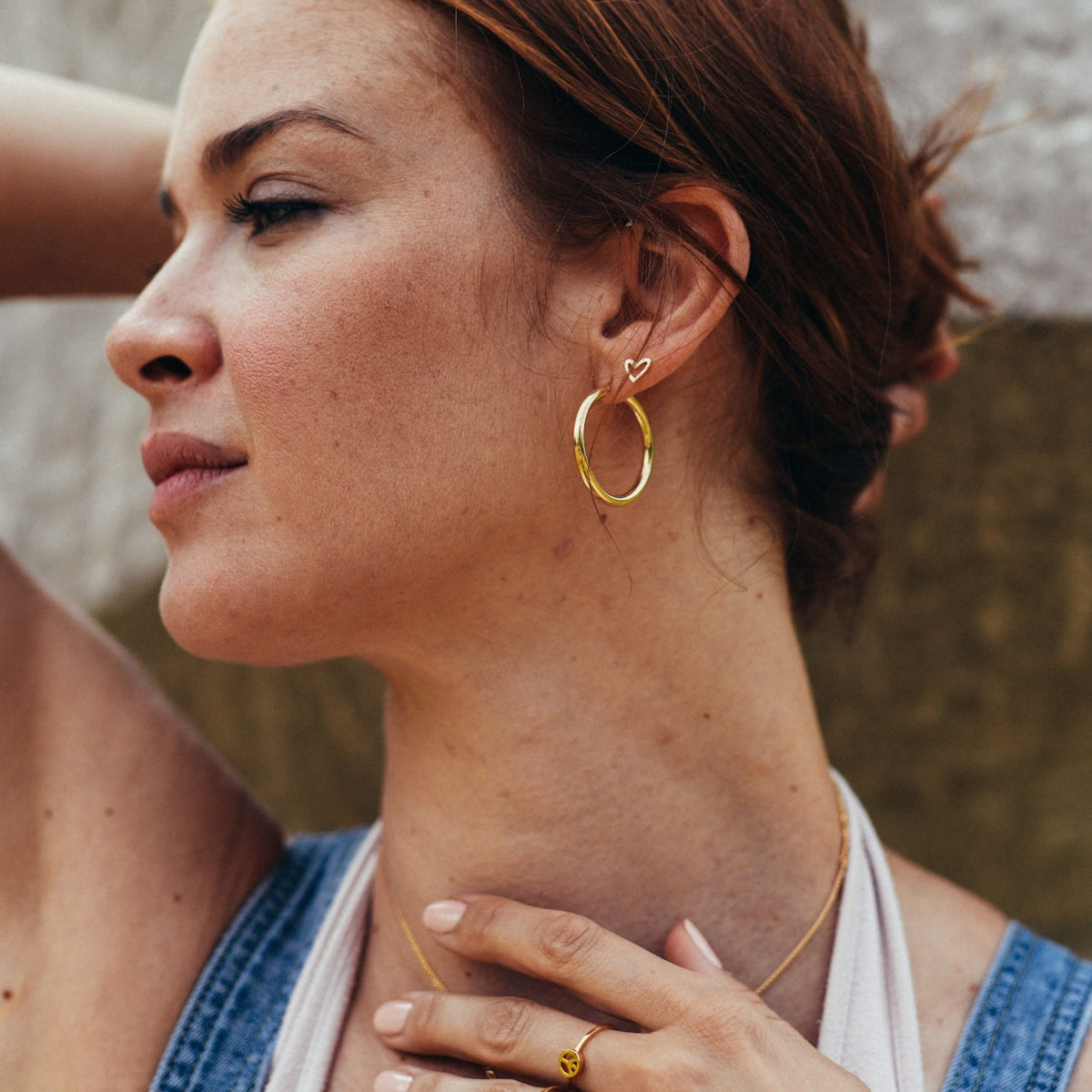 These Love Earrings by Litzi are a charming and meaningful accessory inspired by the spirit of Woodstock. The heart-shaped stud, with "Love" inscribed, is a beautiful symbol of peace, love, and collaboration. These sterling silver earrings are a perfect way to carry that peaceful, loving energy with you.