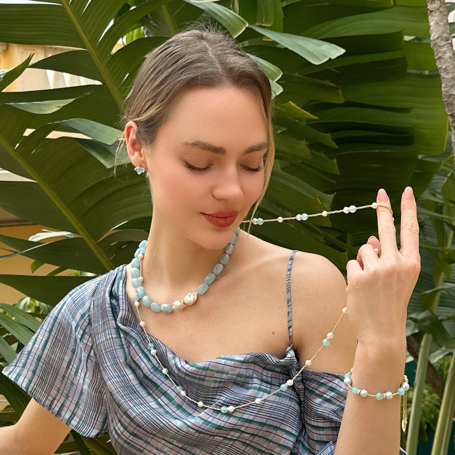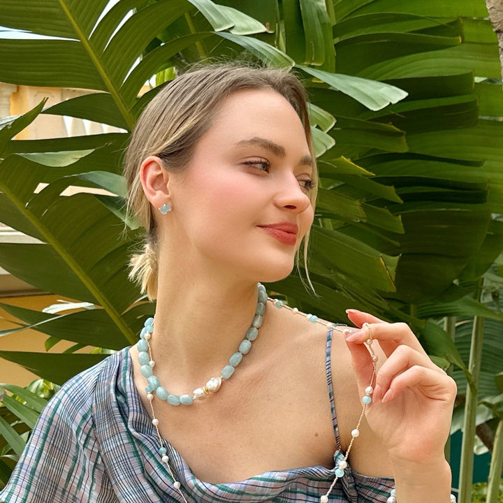 These Unpolished Aquamarine Stone Stud Earrings by Farra are a delicate and minimalist accessory that highlights the raw, unrefined beauty of aquamarine. Each earring features a small, unpolished aquamarine stone, making every pair truly one-of-a-kind with its own unique shape and color variations. The refined and delicate look of these studs is a testament to the idea that true beauty lies in imperfection.