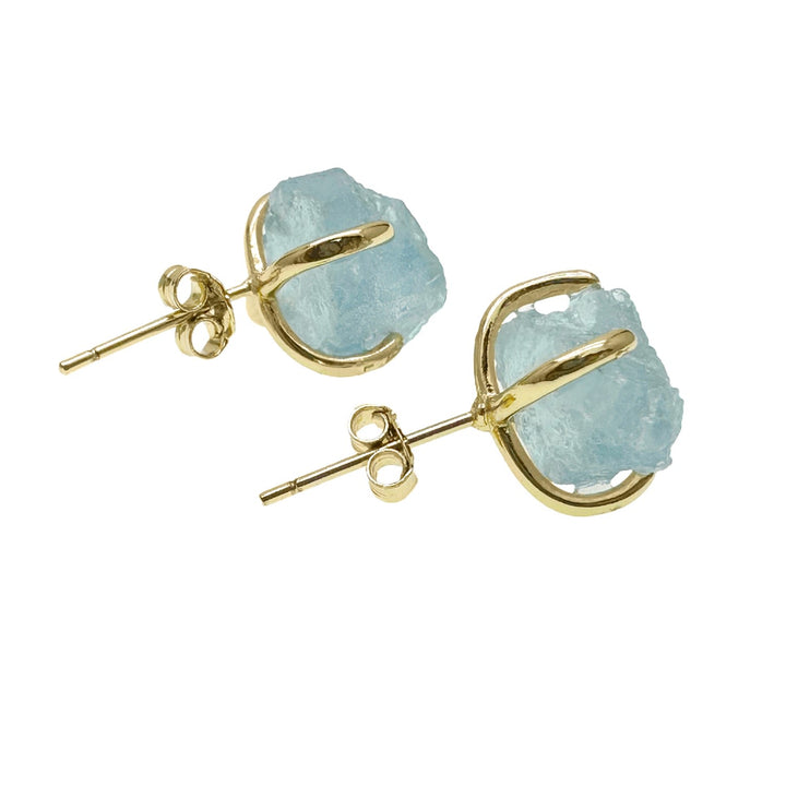 These earrings feature natural, unpolished aquamarine stones set on 925 sterling silver pins with a 14k gold-plated brass setting.