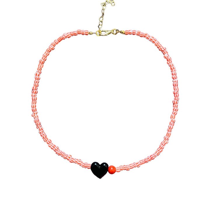 This handcrafted necklace features striped glass beads and a Murano glass heart charm, finished with a heart-shaped extension chain for an adjustable fit.