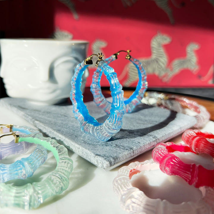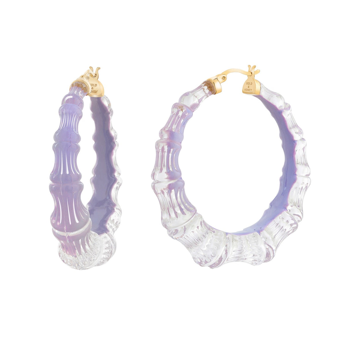 The Bamboo Illusion Hoop Earrings in Lavender by Gold & Honey are a classic 90s hoop with a twist. The glass-like lucite and hand-painted enamel give these hoops a pop of color and shine. When viewed from the front, they appear as a vibrant, full color, but when you turn to the side, they are clear, providing a unique illusion effect. These earrings are a fun and bold statement piece that everyone will love.