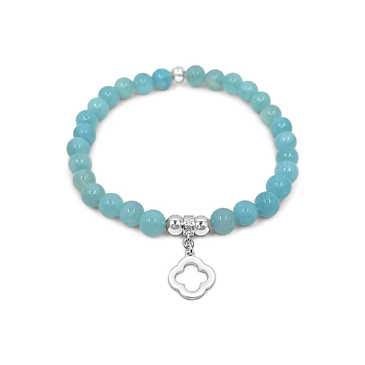 This bracelet is made with Jade Blue beads and a gold clover charm. The specific gold material is not specified but the brand's other listings imply a 14k gold plated on Sterling Silver 925 base.