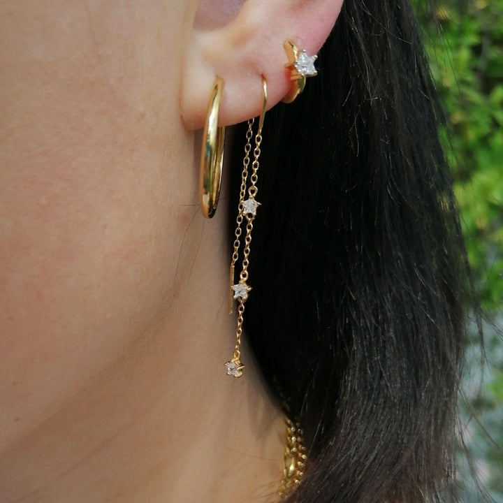 These Gold Sparkling Star Threader Earrings by Scream Pretty are a glamorous and sophisticated accessory designed for subtle movement and sparkle. The unique threader design features three sparkling stars in a row, allowing for all-day comfort and a touch of effortless style. They are perfect for adding a sense of celestial elegance to your look, providing a delicate yet eye-catching shimmer with every turn of your head. These earrings are a chic and timeless choice for any occasion.