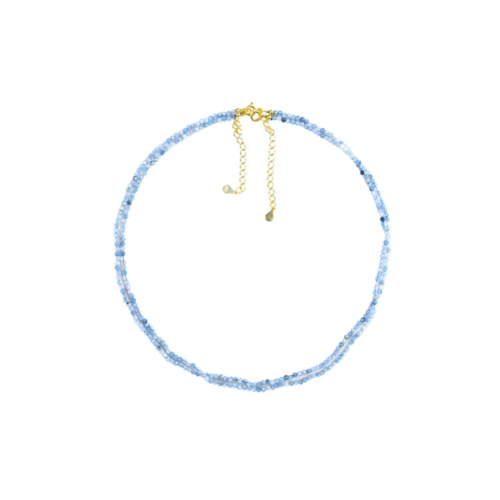 This necklace is made with aquamarine beads and has a 14k gold-plated 925 sterling silver clasp.