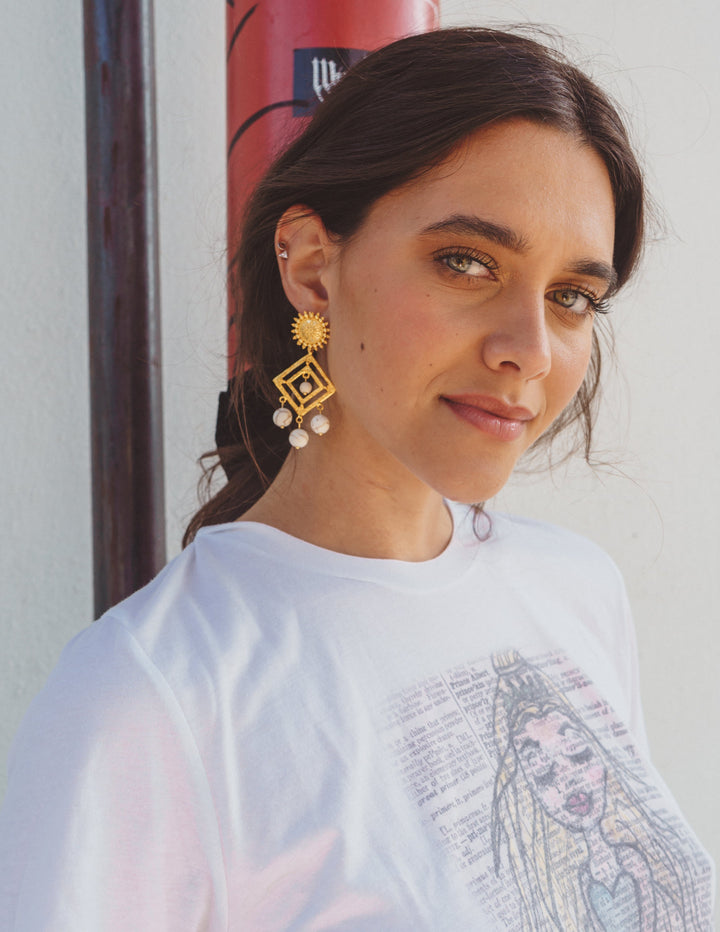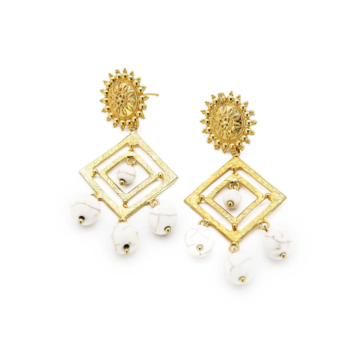 These Esther Handmade Drop Earring by Adiba are a stunning handmade accessory. The earrings feature a 22k gold-plated brass base with beautiful natural turquoise stones. Due to their handmade nature, each item is limited, and slight variations in color or shape may occur. They are a glamorous piece for any collection, with a post-back design and are nickel and lead-free.