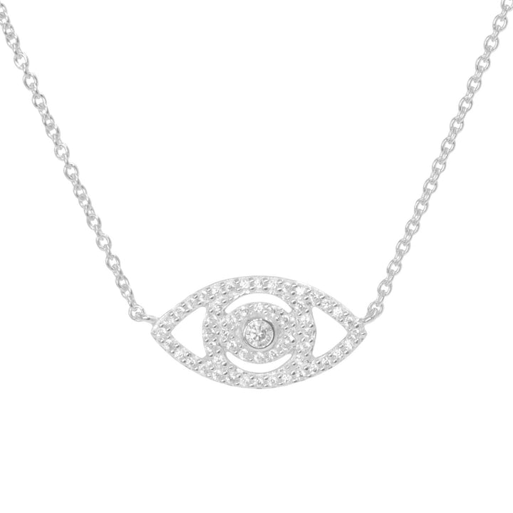 925 sterling silver with pave crystal-set double evil eye charms. Adjustable silicon slider clasp, up to 46cm length.
