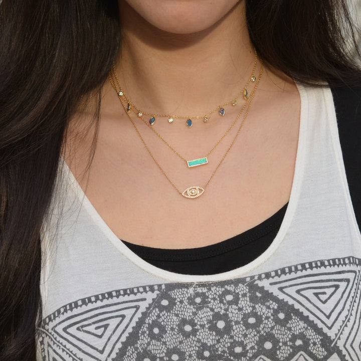 This Evil Eye Crystal Necklace Silver by Kamaria embodies ancient protection with contemporary elegance. Featuring twin evil eye charms encrusted with crystals, it symbolizes resilience and spiritual safeguarding. Designed for layering or everyday wear, this meaningful piece also supports Kamaria’s mission of empowerment, making it as purposeful as it is beautiful.