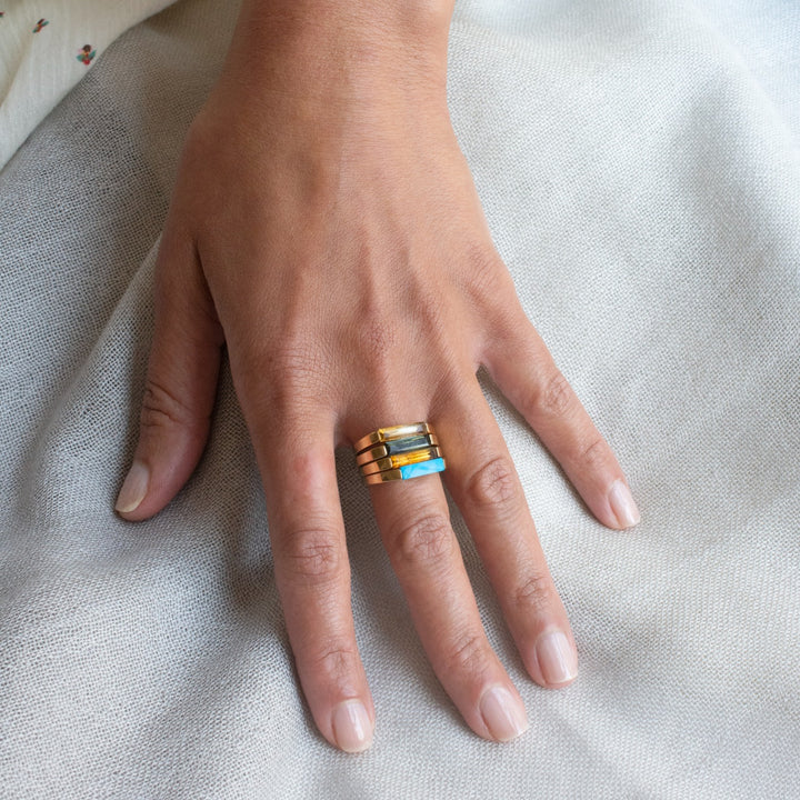 This 14K Gold Plated Slim Stacking Ring Green Tourmaline by Preeti Sandhu highlights architectural elegance in a minimalist band. A half-bezel set natural tourmaline glows with deep green richness, symbolizing vitality and renewal. Slim and refined, it layers effortlessly or shines solo as a statement of understated luxury.