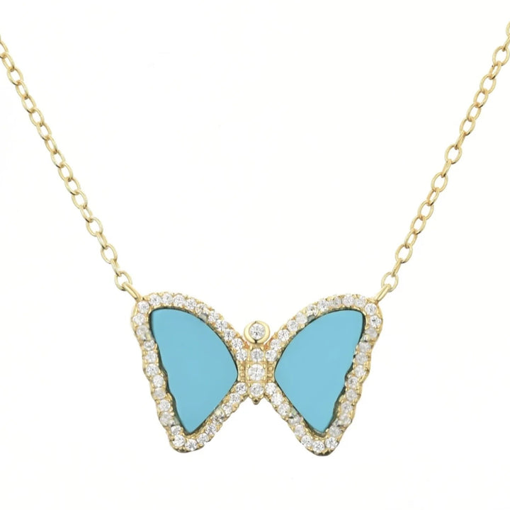 The Mini Gemstone Butterfly Turquoise is a delightful and delicate charm. This butterfly is made with a lab-created gemstone in a turquoise color and is set in 925 sterling silver. The wings are surrounded with pave crystal. The charm has a 14k gold-plate over the silver.