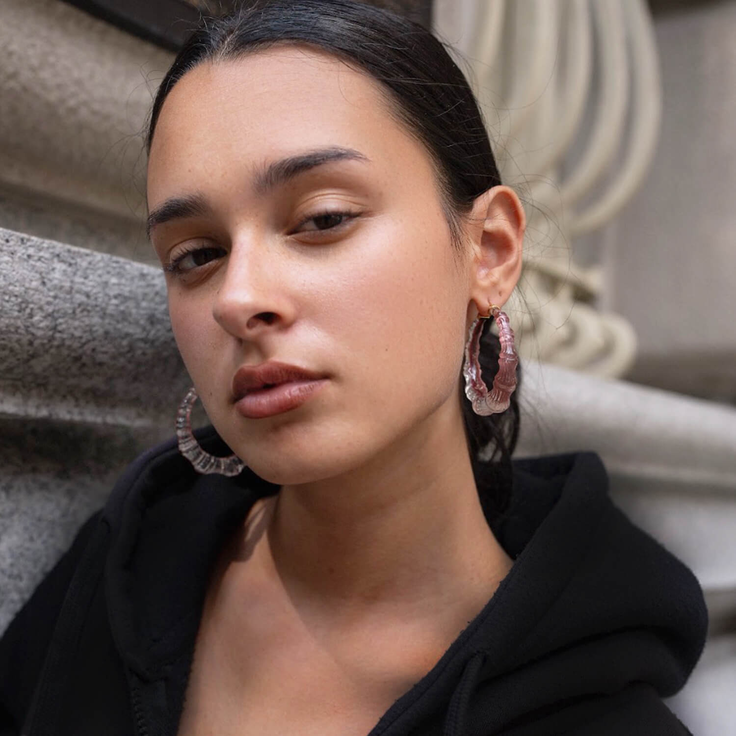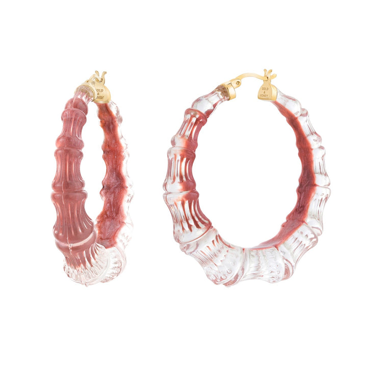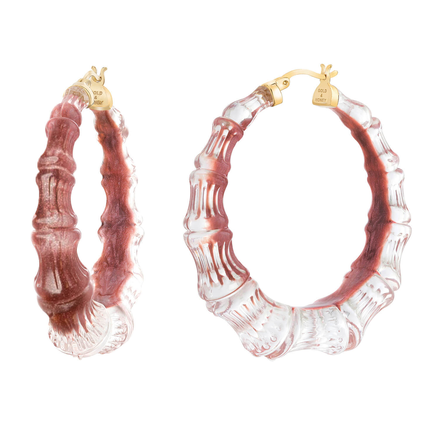 These Bamboo Illusion Hoop Earrings by Gold & Honey are a classic 90s hoop with a twist. The glass-like lucite and hand-painted cocoa brown enamel give these hoops a color pop and shine, making them a true must-have. When you look at them from the front, they are a vibrant, full color, and when you turn to the side, they are clear, providing a unique illusion effect. These earrings are a fun, bold statement piece that everyone will love.