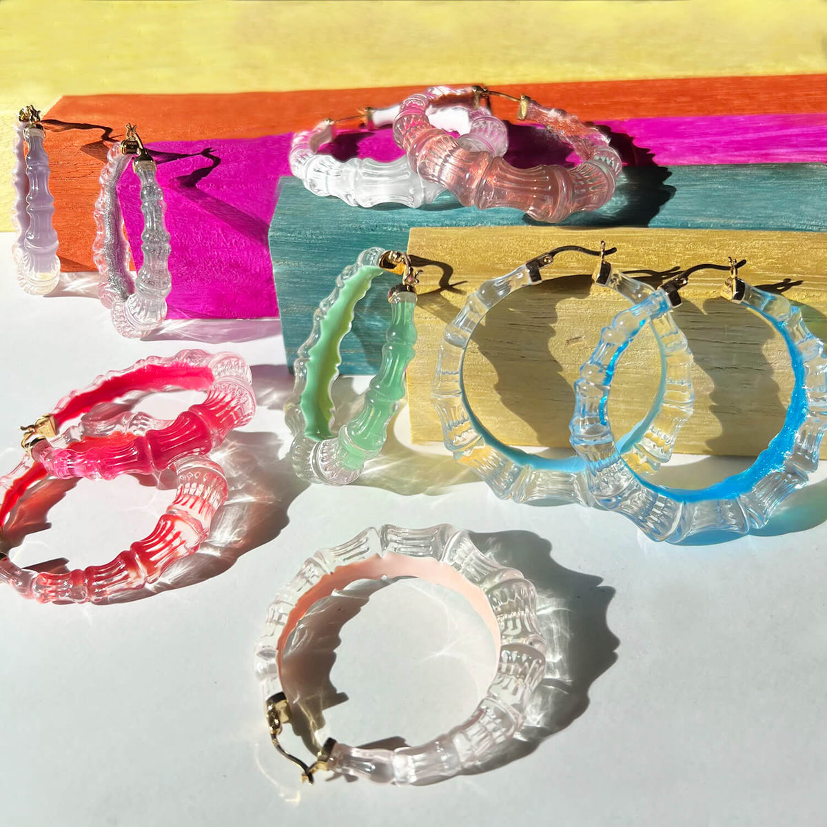 These hoops are handcrafted from lucite with hand-painted enamel and feature 14k gold-plated sterling silver posts.