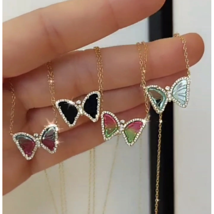 Genuine black onyx wings with crystals. Gold-plated sterling silver. Adjustable slider chain up to 18".