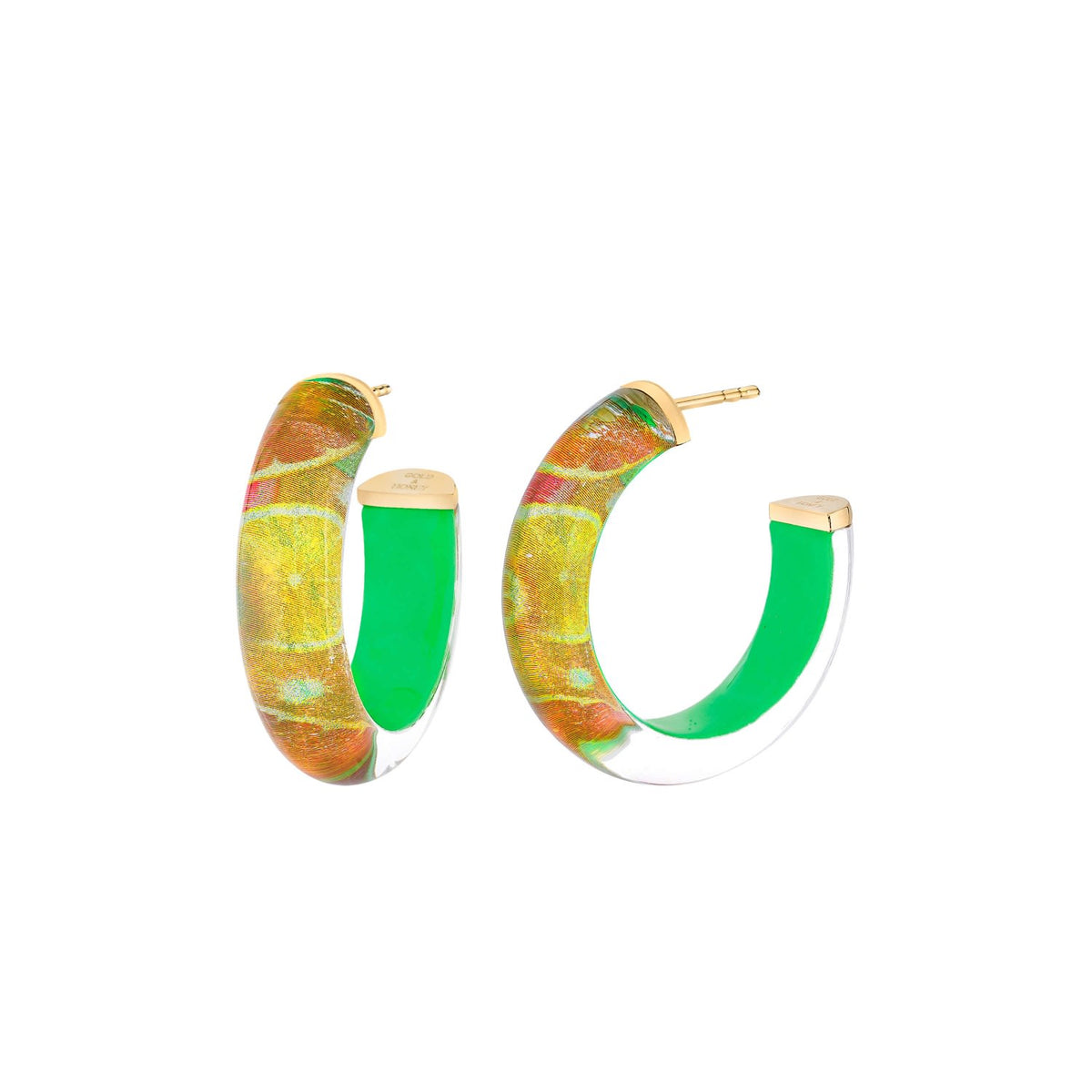 These hoops are made of handmade lucite with a citrus print and have 14K gold-plated sterling silver posts.