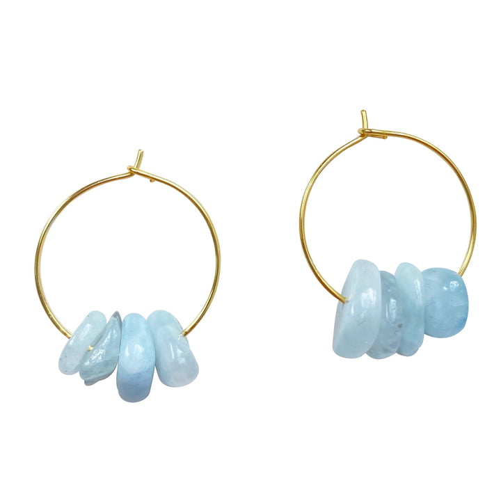 These hoop earrings are handmade from gold-plated brass and feature one-of-a-kind aquamarine gemstone chips.