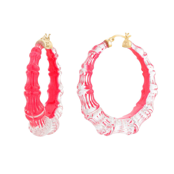 These Bamboo Illusion Hoop Earrings in Pink Peacock by Gold & Honey are a classic 90s hoop with a twist. The glass-like lucite and hand-painted enamel give these hoops a color pop and shine, making them a true must-have. When you look at them from the front, they are a vibrant, full color, and when you turn to the side, they are clear, providing a unique illusion effect. These earrings are a fun, bold statement piece that everyone will love.