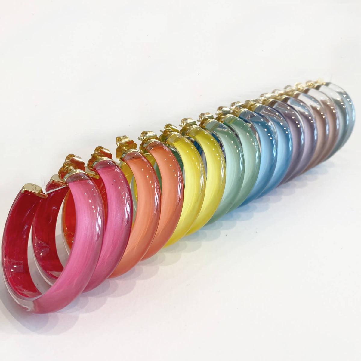 These handcrafted hoops are made from lightweight lucite, hand-painted with enamel, and feature gold-plated sterling silver posts. The design creates a unique optical illusion with color visible from the front and a clear appearance from the side.