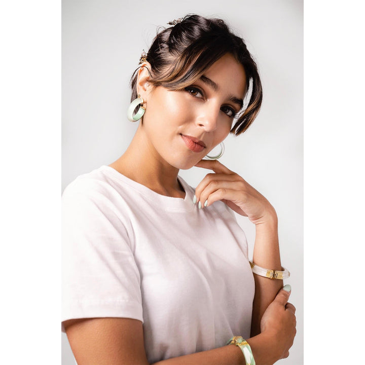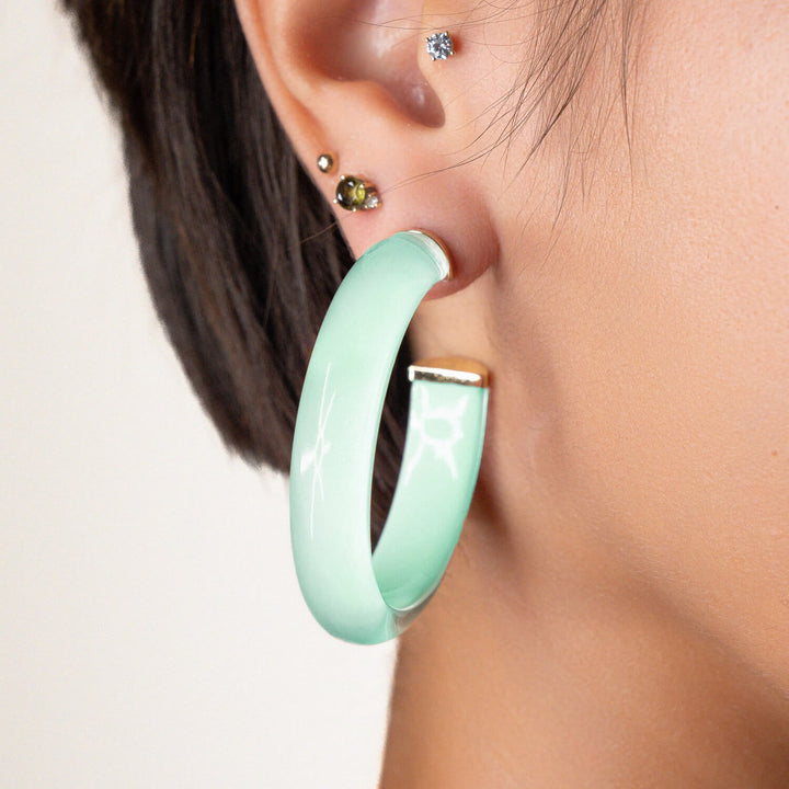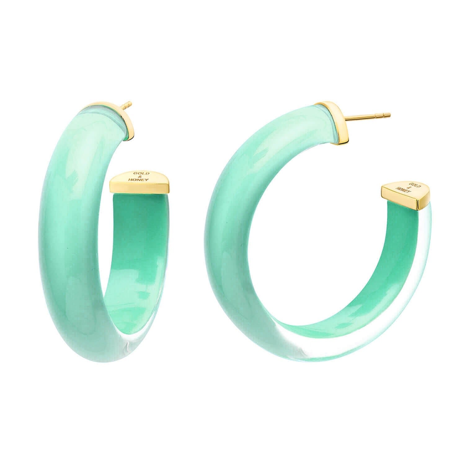 These Medium Illusion Hoops in Mint Green by Gold & Honey are a delightful and refreshing accessory that offers a unique twist on the classic hoop. Their handcrafted design creates a playful illusion: a vibrant mint green color from the front and a completely clear profile from the side. This clever dual-view makes them a versatile and intriguing piece, perfect for adding a subtle pop of color and a touch of modern artistry to any outfit. They symbolize a lighthearted and creative approach to style.