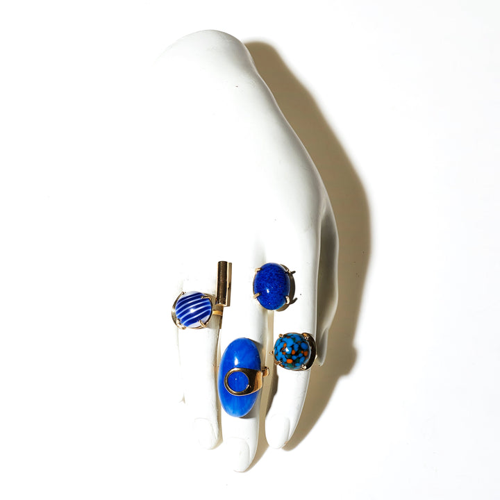 The Orbit Cocktail Ring in Sea by Castlecliff is a stunning and unique accessory. The aesthetic is bold and artistic, featuring a polished brass bar and a hand-set vintage glass stone in faux lapis. The design is both modern and inspired by vintage elements, creating a captivating look. This ring is a statement piece, perfect for adding a touch of glamour and personality to any outfit. Handcrafted in NYC from 100% recycled brass, it is a sustainable and ethical choice.