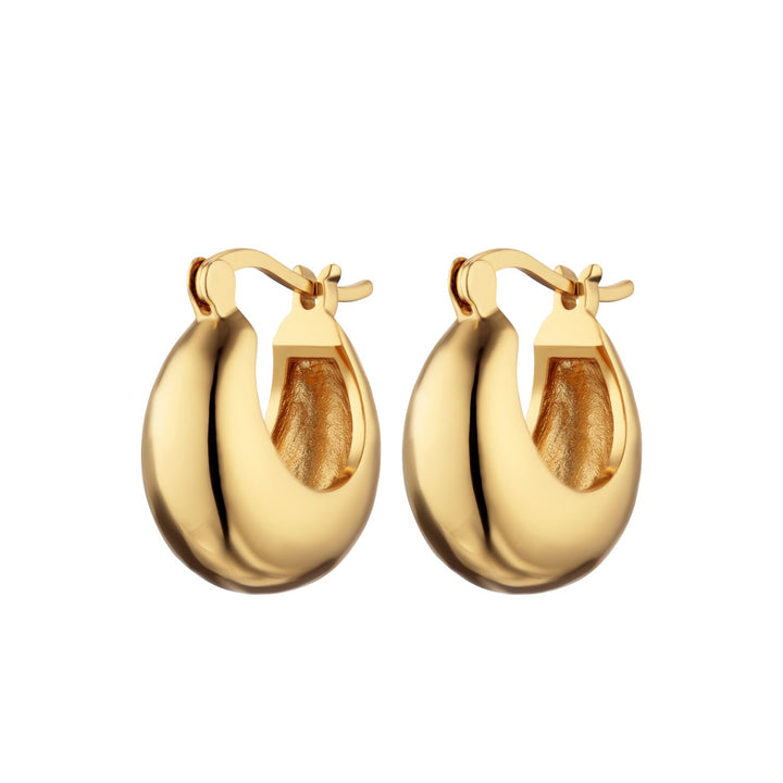 These huggie hoop earrings are made from 18ct gold-plated recycled brass. They have a puffed, curved silhouette and a hinged clasp. The design is hollowed-out, making them lightweight.