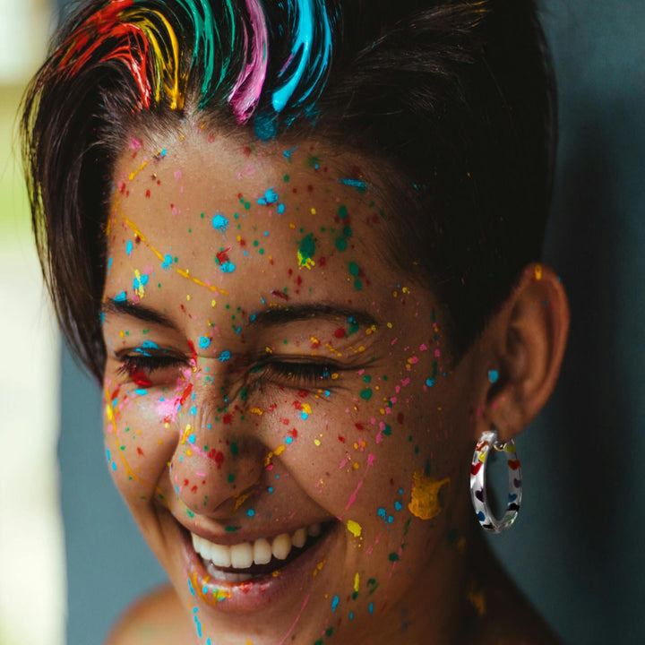The Flat Hoops With Rainbow Hearts by Gold & Honey are a fun and colorful accessory. The hoops are a small, lightweight design with a rainbow hearts motif. The aesthetic is cheerful and playful, offering a "pop of color and a bit of shimmer." These lightweight earrings are great for all ages and are a fun way to celebrate with rainbow jewelry. They are handmade from lucite and have 14K gold-plated sterling silver posts.