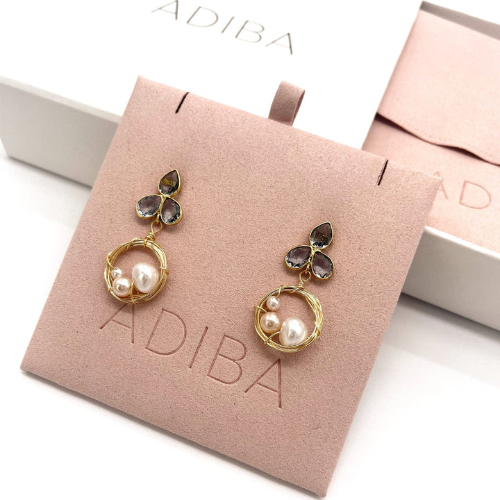 These Bird's Nest Handmade Drop Earring by Adiba are a unique and delicate accessory. They are handmade with a 22k gold plated brass base, featuring light blue quartz stones and real fresh water pearls. The bird's nest is handmade with 18k gold plated wire. The earrings are nickel and lead-free and have a post-back closure. The collection is limited and not mass-produced, making them a one-of-a-kind glamorous piece.