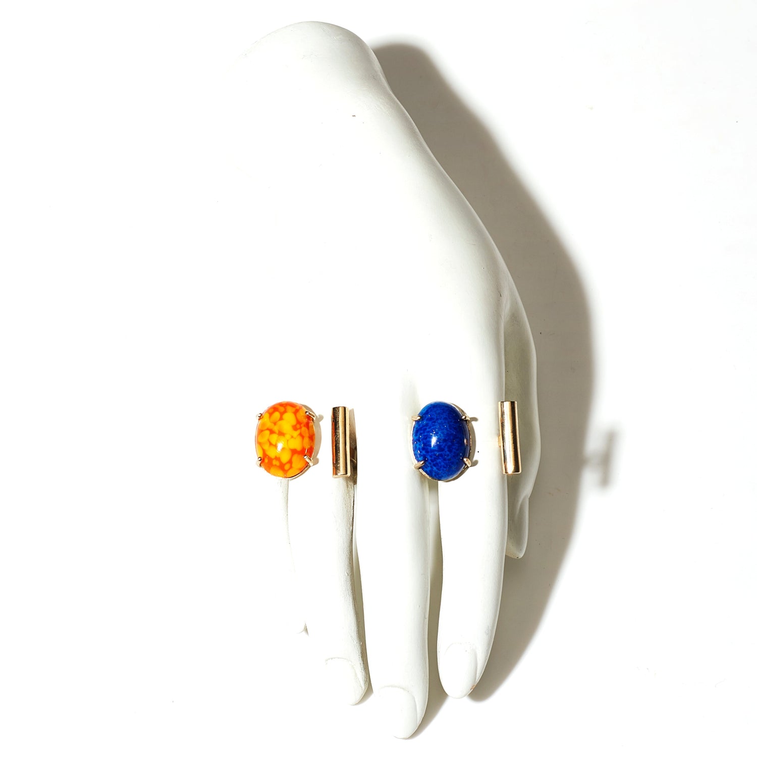 This Orbit Cocktail Ring In Flame by Castlecliff is a bold and striking accessory. The ring features a polished brass bar and a hand-set vintage glass stone, creating a unique and sophisticated design. Handcrafted in NYC from certified 100% recycled brass via the ancient art of lost wax casting, each piece is one-of-a-kind. Its rich patina will develop with wear, making it a unique and personal piece that tells a story.