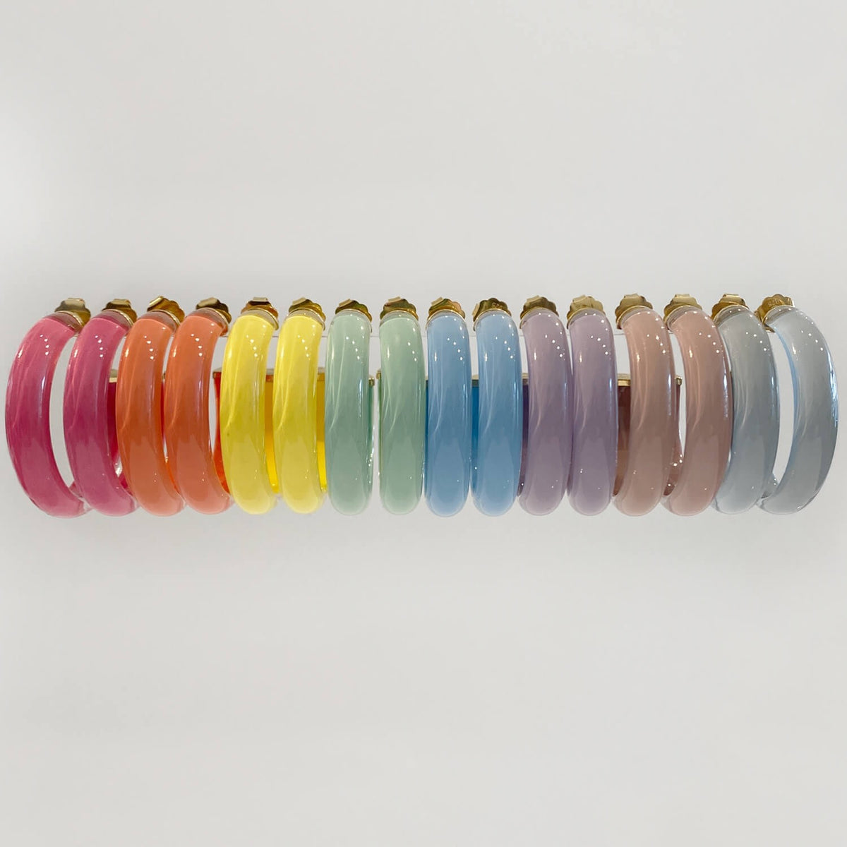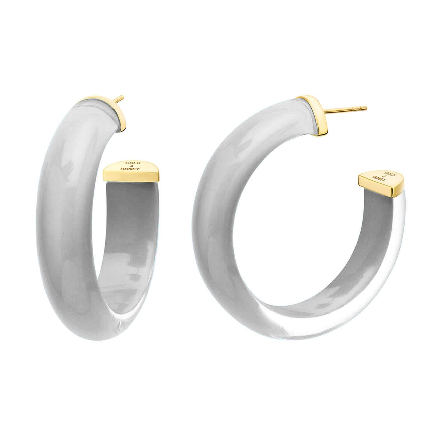 The Medium Illusion Hoops in Grey by Gold & Honey are a truly unique accessory with a playful, dual design. When viewed from the front, the hoops appear in a full grey color, but when turned, they reveal a clear side. This "illusion" effect adds a fun and dynamic element to the design. Handcrafted from lucite with hand-painted enamel and gold-plated sterling silver posts, these earrings are a chic and modern statement piece.