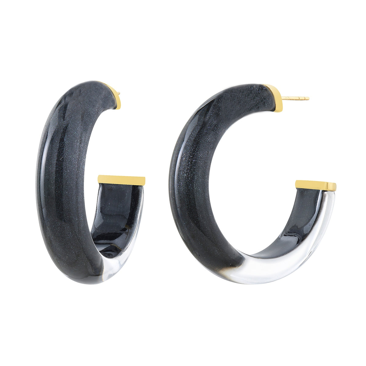 These hoops are handcrafted with lucite, hand-painted shimmer black enamel, and gold-plated sterling silver posts.