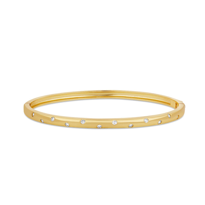This bangle is made of 14k gold-filled material. It is an oval shape with a hinge closure and is set with cubic zirconia stones.