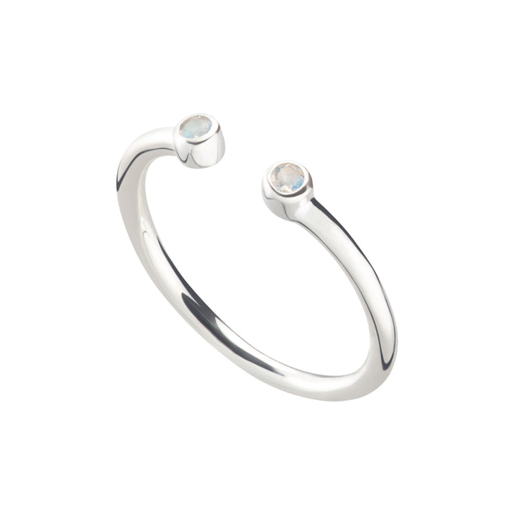 Recycled 925 sterling silver with two natural faceted moonstones. Adjustable open band (fits UK sizes L–P).