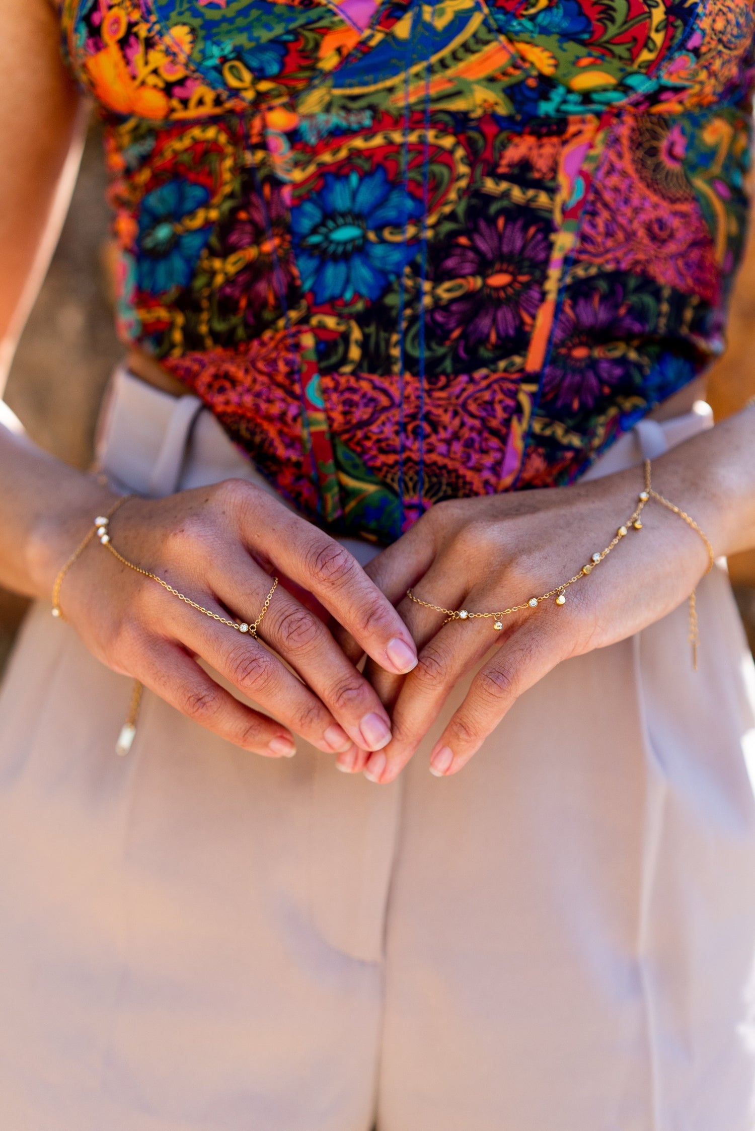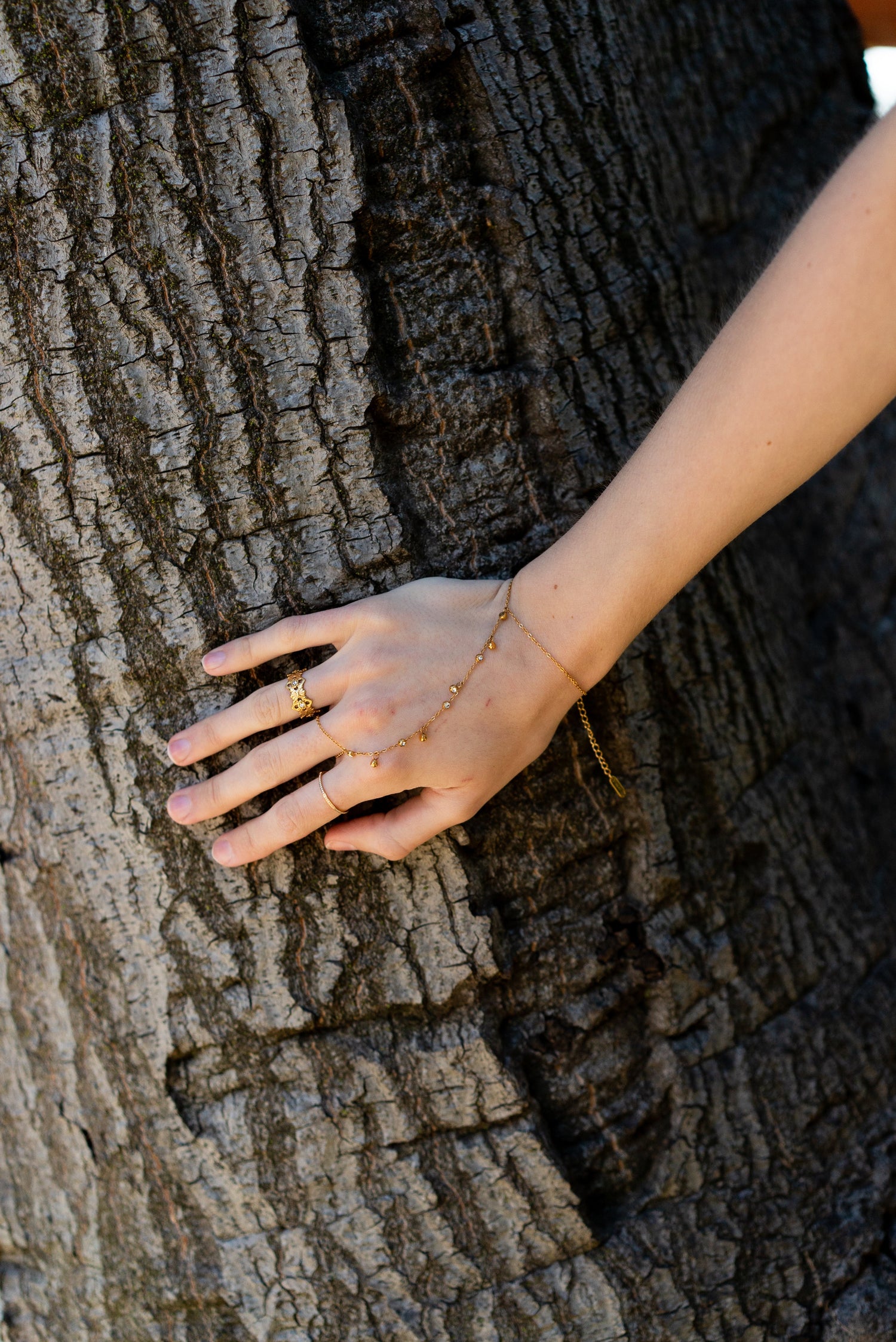 Crafted from 18k gold-plated stainless steel, this hand chain is a durable and elegant accessory.