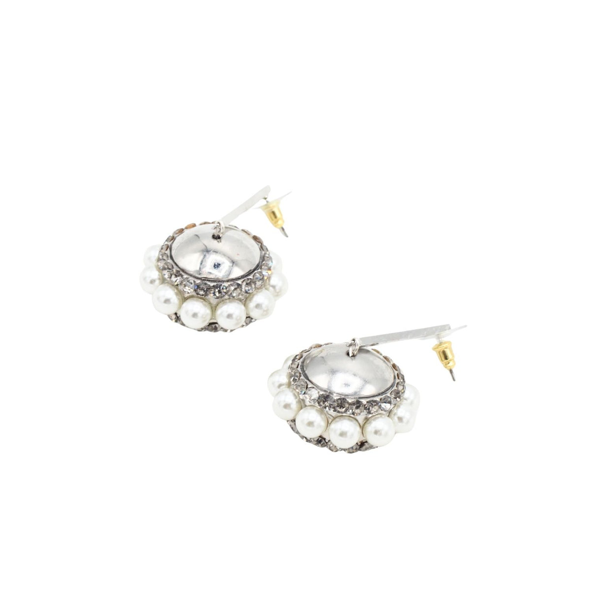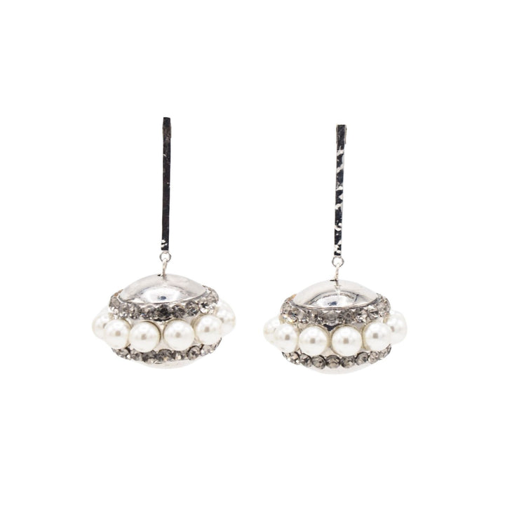 These earrings are crafted from rhodium-plated brass with a crystal. They feature a thin rectangular bar and a round rococo pendant. The drop length is 6cm, and each unit weighs 23g.