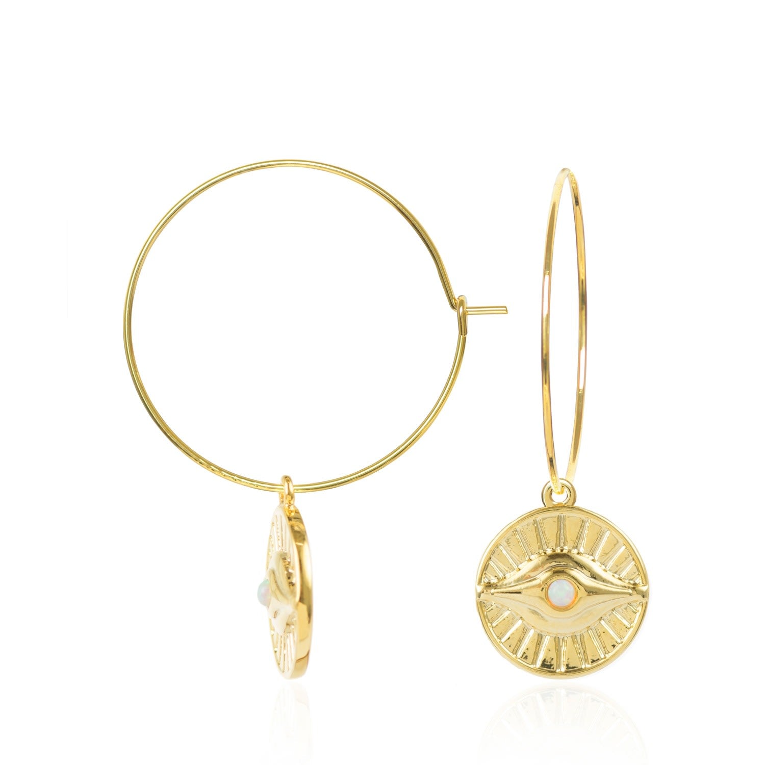 These hoops are crafted from a plated metal with 16k gold plating. They feature a delicate opal eye charm and are sold as a pair.