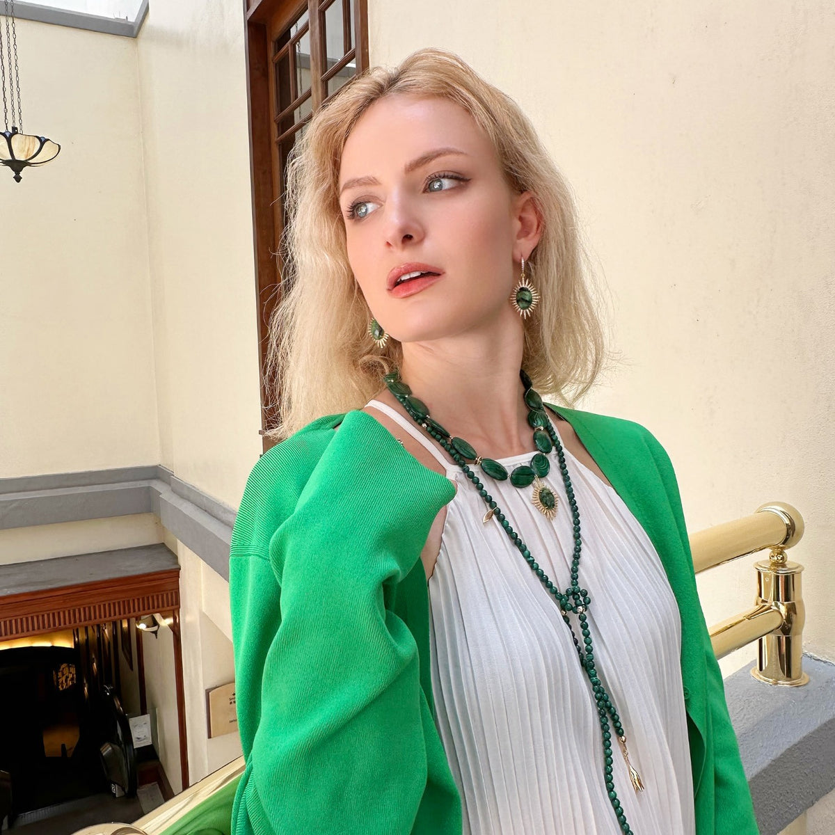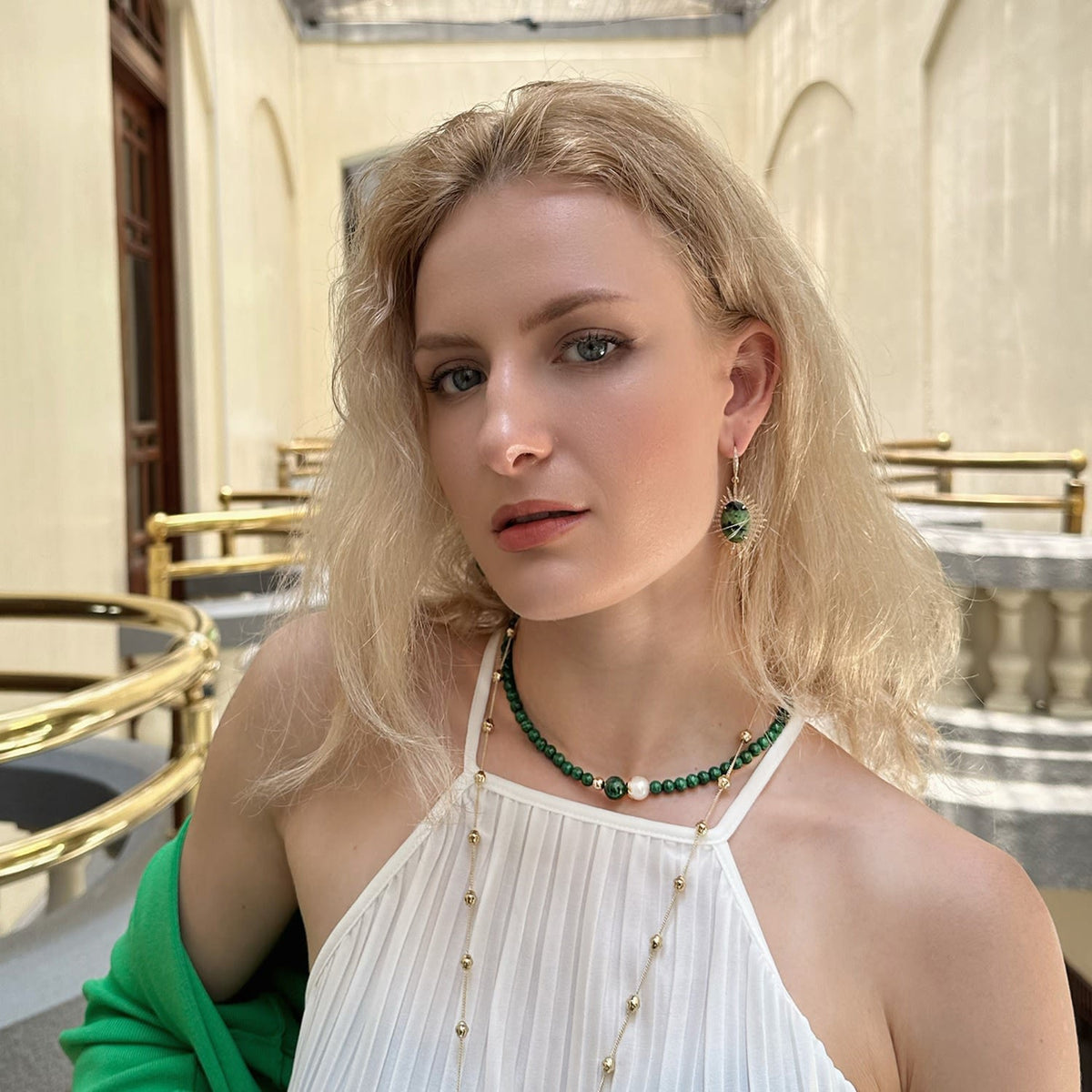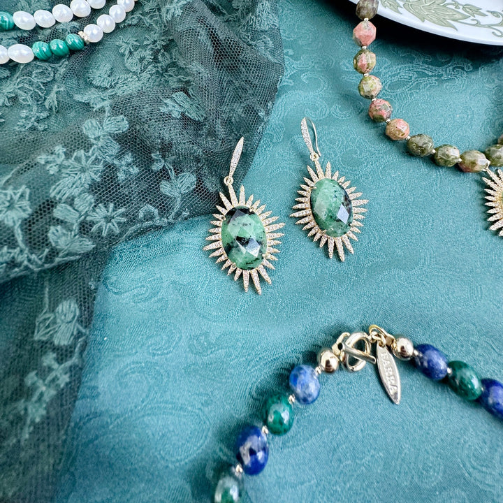 These Epidote Hook Earrings by Farra offer a sophisticated look for any style. The simple design allows the epidote stones to shine, making them a great everyday accessory. They pair perfectly with a malachite necklace and a simple outfit to create a polished and elegant look.