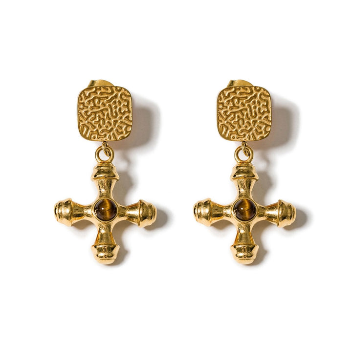 These Byzantine Earrings in Tiger Eye by Kybele Studio merge antique elegance with modern edge. The sculptural cross-drop design is centered by a warm tiger eye stone, long associated with grounding, clarity, and protection. With their textured stud and statement silhouette, these earrings channel timeless strength and bold sophistication.