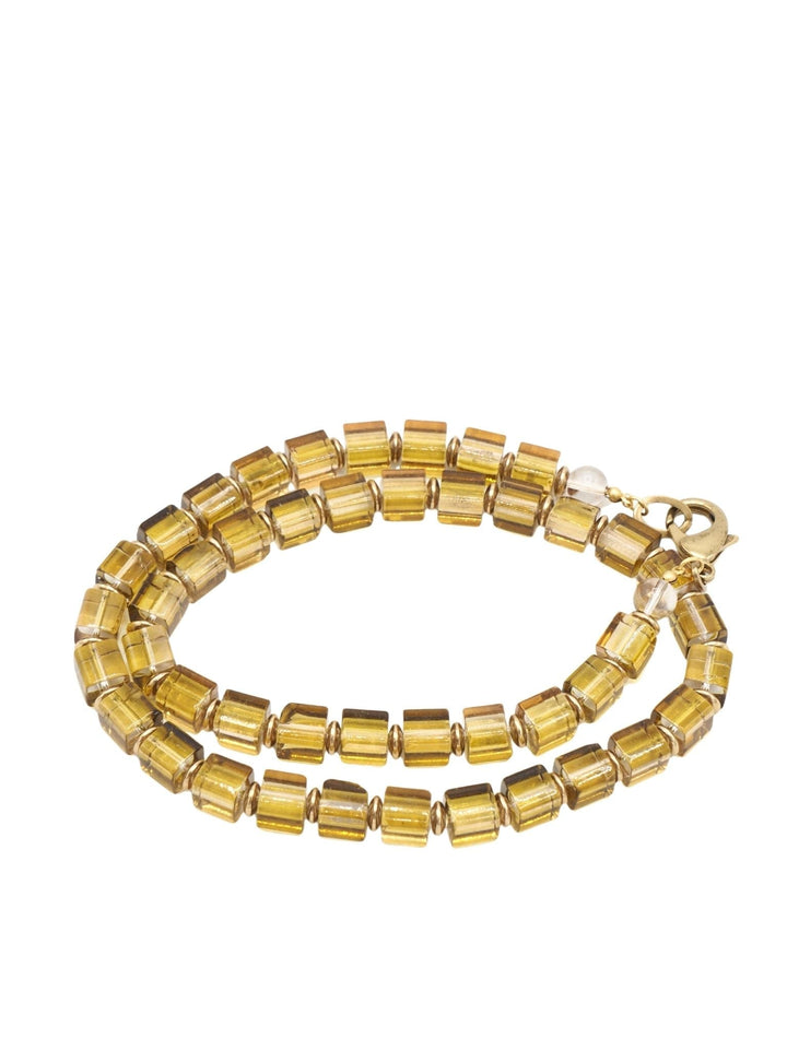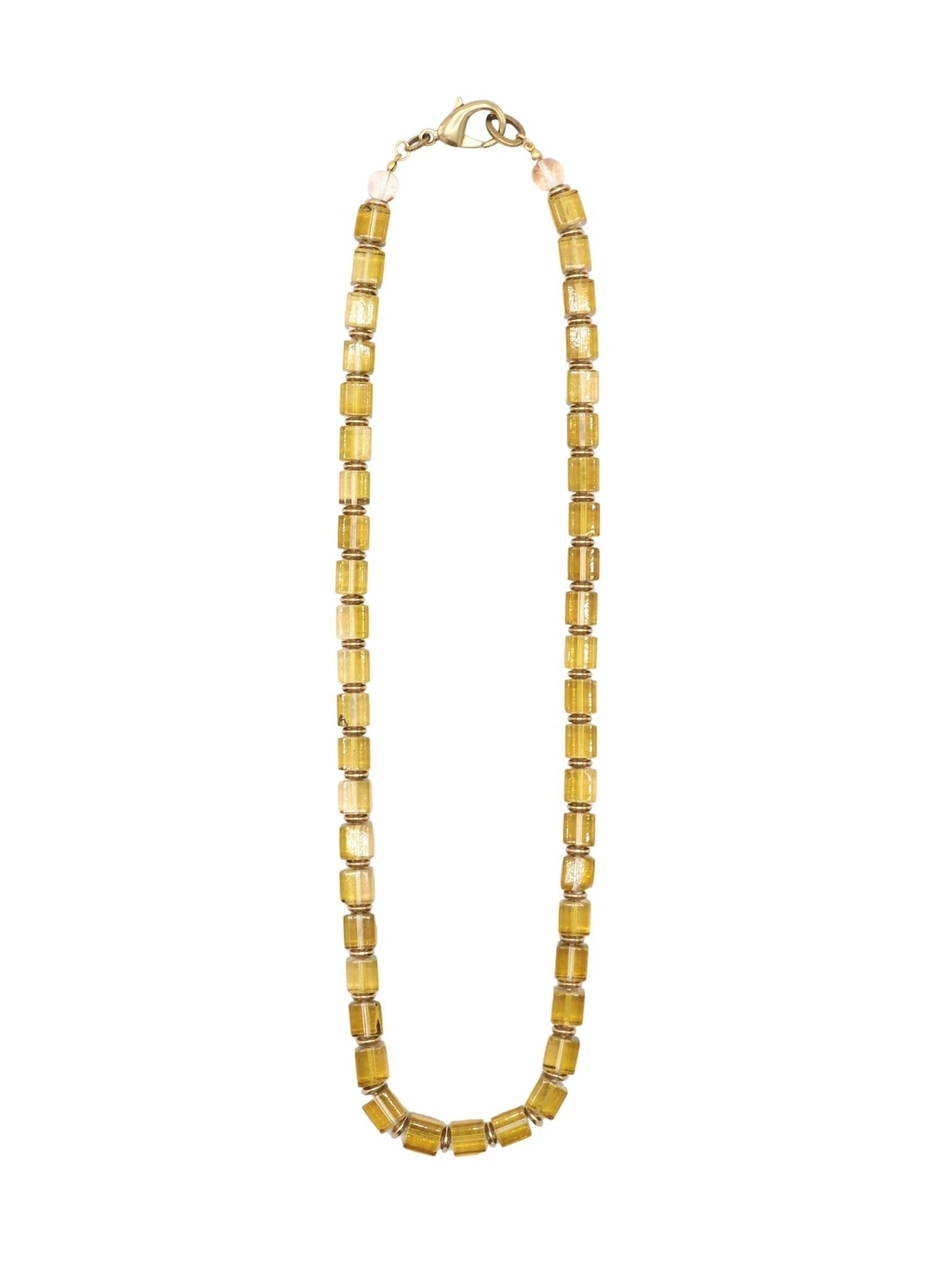 This Square Tunel Necklace - Yellow by Sita Nevado is a striking and modern piece designed to make a bold statement. The necklace features a series of square crystal pieces, creating a structured and artistic aesthetic. It's finished with two bicolor balls at the ends, adding a unique and playful touch to the design. This necklace is perfect for those who appreciate contemporary jewelry that stands out, adding a touch of confident style and a pop of color to any outfit.
