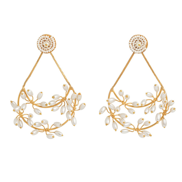 The Belle De Perla Gold Earrings by Meraki by Rashmi Bajaj are a stunning representation of botanical elegance. These push-back earrings feature intricate 24k gold-plated branches adorned with clusters of lustrous white freshwater pearls, which are reminiscent of blossoming flowers. Suspended from circular studs, they add an extra touch of refinement to any outfit.