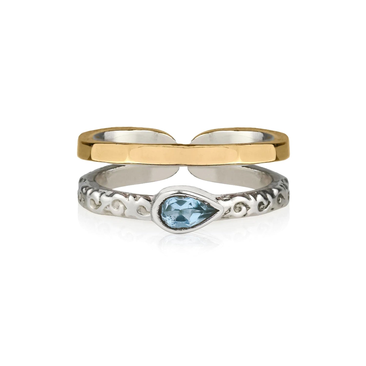 This ring is handmade from sterling silver and brass, and features a pear-shaped blue topaz gemstone. It is hypoallergenic and nickel-free.