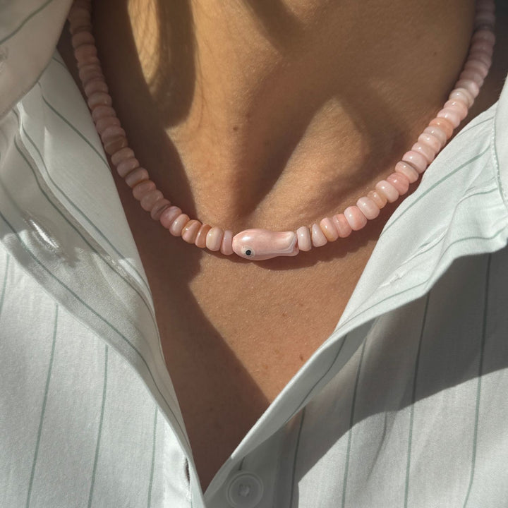 This necklace is made with a hand-painted pink porcelain fish, pink freshwater shell beads, and a gold clasp. The chain length is 16 inches.