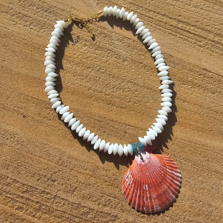 This necklace is a handmade beaded item crafted from 30% real shell and 70% glass beads. The size is adjustable.