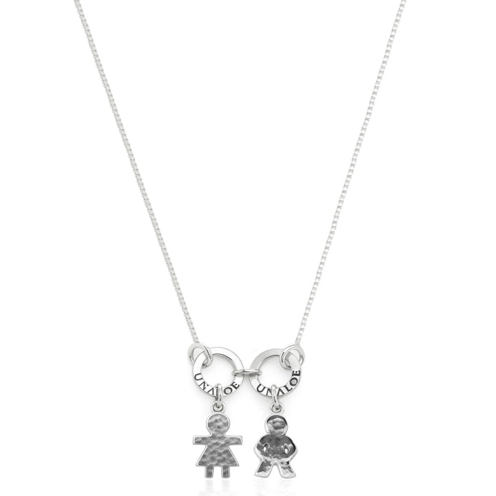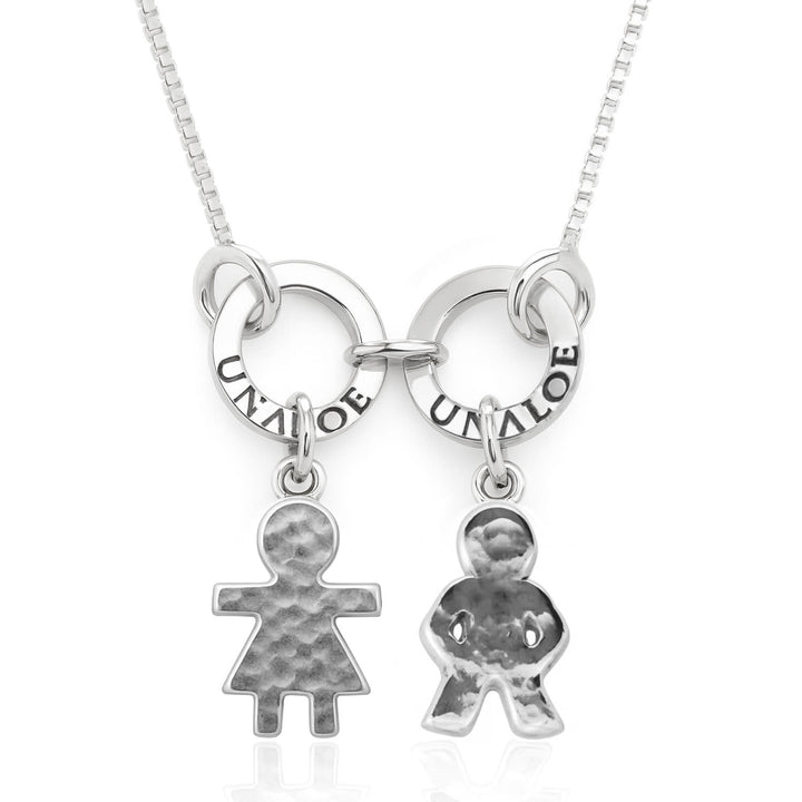 This Sterling Silver Necklace With Boy And Girl Pendants by Unaloe captures the joy of family in a refined jewel. Featuring two baby charms—one boy and one girl—crafted with hammered detailing, it symbolizes cherished bonds and lasting affection. A piece imbued with authenticity, it is perfect for gifting to mothers and families.