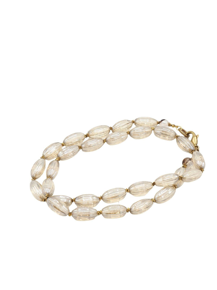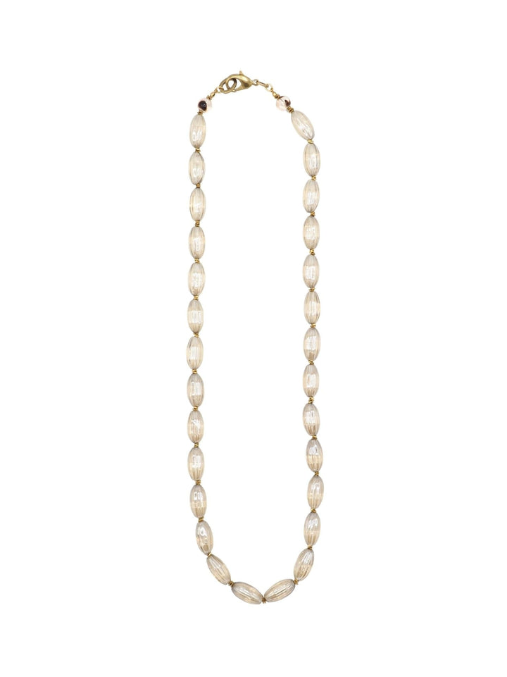 This Olivas Necklace in Champagne by Sita Nevado drapes gracefully with oval and striped crystal beads that shimmer in soft neutral tones. Its elongated design evokes effortless elegance, while the luminous beads bring depth and texture, making it a versatile piece for both daywear and refined evenings.
