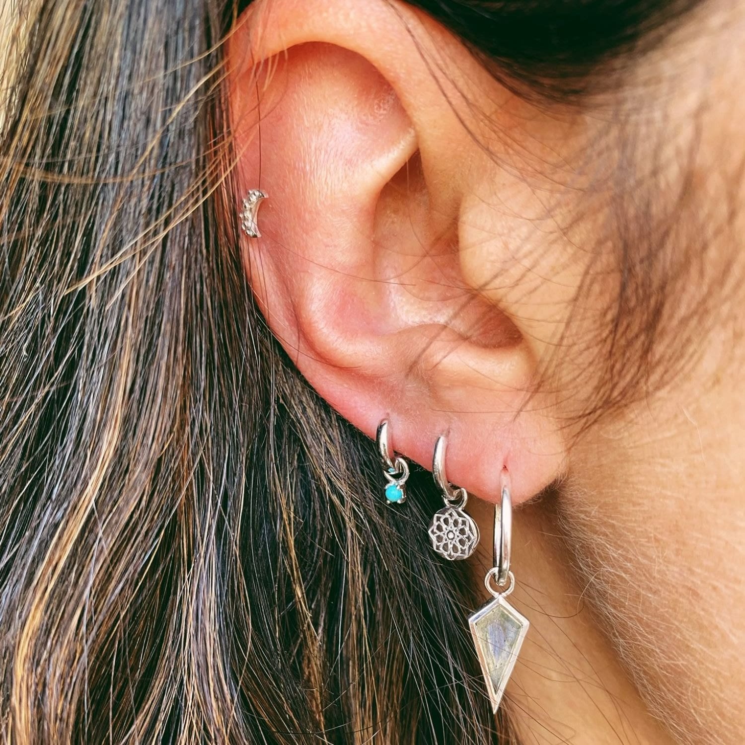 This Labradorite Rhombus Earring Charm Sterling Silver by Zohreh V. Jewellery is a stunning and versatile piece for elevating your ear stack. Sold as a single charm, it features a beautifully cut labradorite stone in a distinctive rhombus shape, known for its captivating blue-to-green iridescence. Crafted from solid sterling silver, this charm is designed for everyday wear and a seamless integration into your existing jewelry collection. It's a perfect way to add a pop of subtle color and a touch of magical charm to your look.