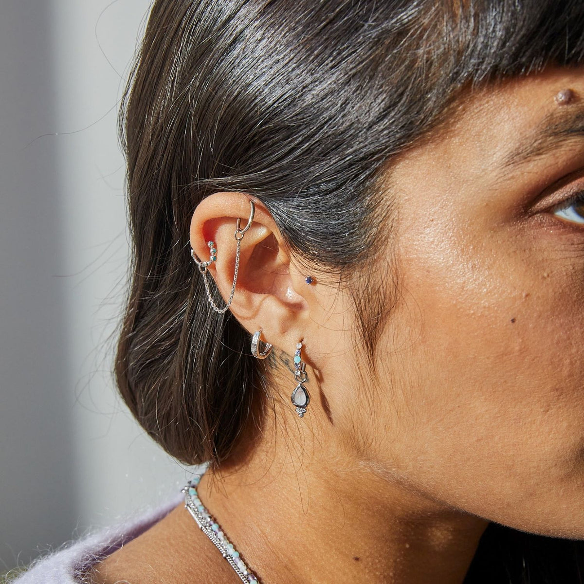 This earring is made from recycled sterling silver and features a white sapphire gemstone. It is sold as a single.
