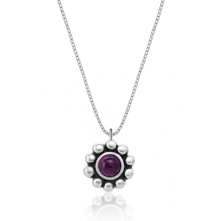 This Sterling Silver Violet Necklace by Unaloe blends floral grace with artisanal mastery. A finely sculpted violet flower cradles a rich amethyst at its center, symbolizing creativity, clarity, and elegance. Each piece is carefully handmade, ensuring subtle uniqueness. Its luminous purple hues and delicate design make it a perfect piece for both everyday wear and special occasions.