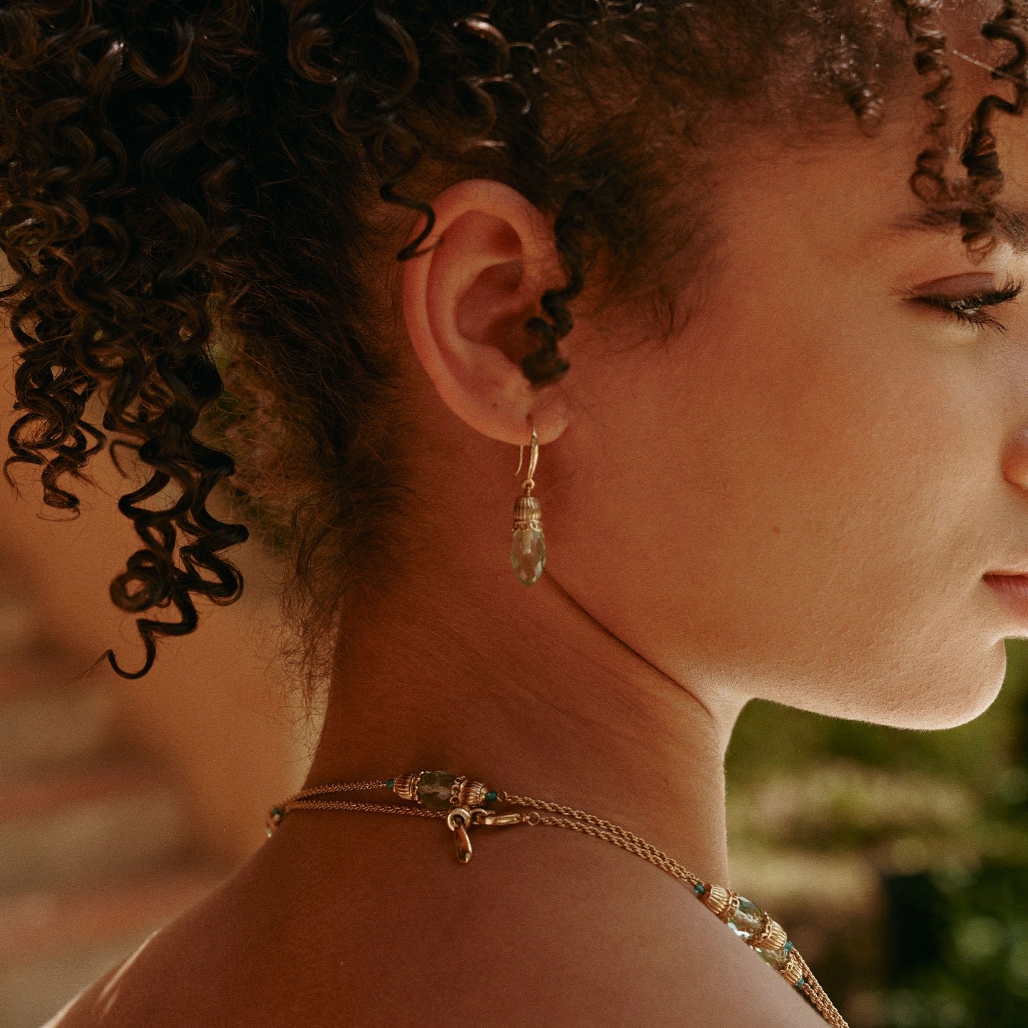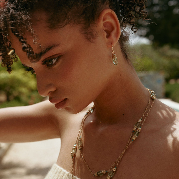 These Nut Fairy Charm Earrings by Retro Chic are a whimsical and elegant accessory, embodying a sense of organic growth and vintage charm. The design, inspired by budding nuts, features green art glass that adds depth and energy to the piece. Handcrafted through 32 meticulous steps, these earrings combine a unique vintage Italian aesthetic with modern simplicity. Their gracefully draping silhouette beautifully highlights the neckline, bringing a quiet sophistication to both everyday wear and special occasions.