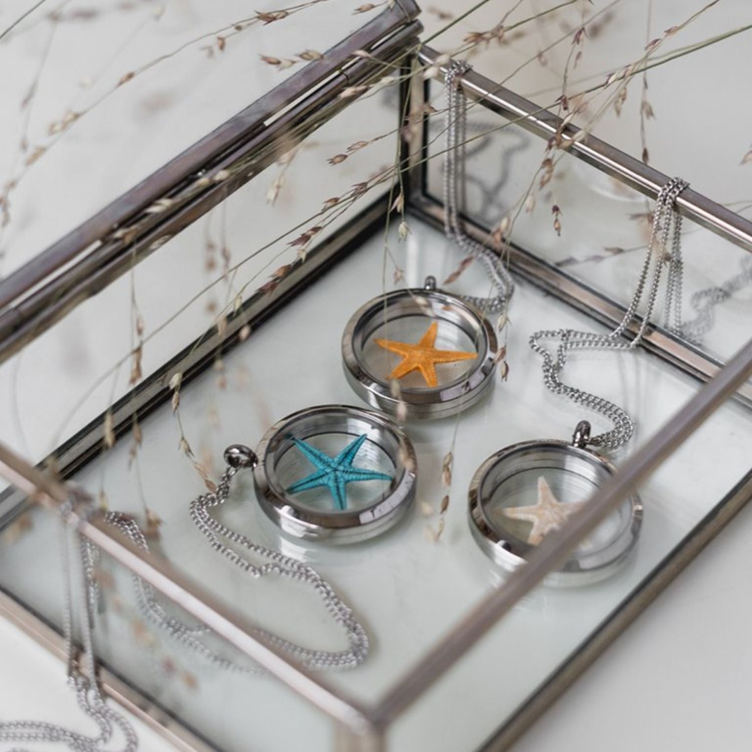 This handmade necklace is made of Glass, stainless steel, and a natural starfish dyed sea-blue. The chain is not explicitly described, but the pendant is.
