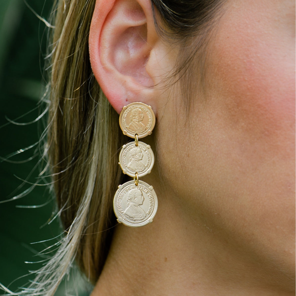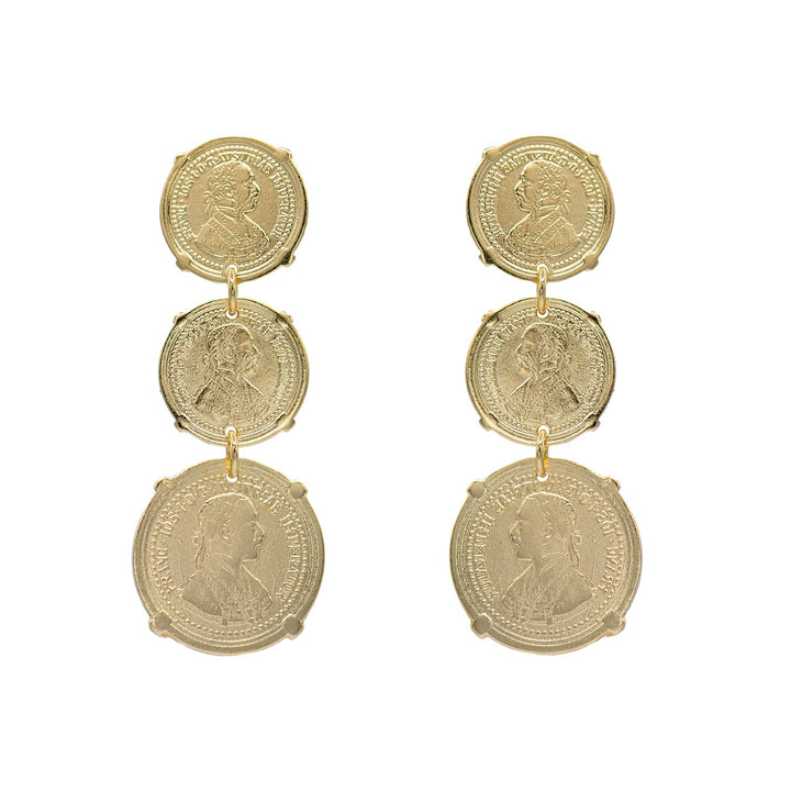 These dangle earrings are made with an unspecified metal plated with 18k gold and feature three vintage coins. They are a single pair.
