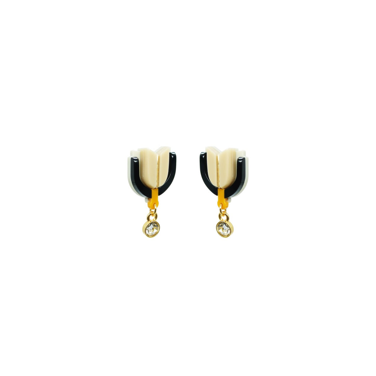These handmade earrings are made from acrylic. They feature glass rhinestones, a zamak pendant, and a brass chain with a golden finish. The pin is made of stainless steel.
