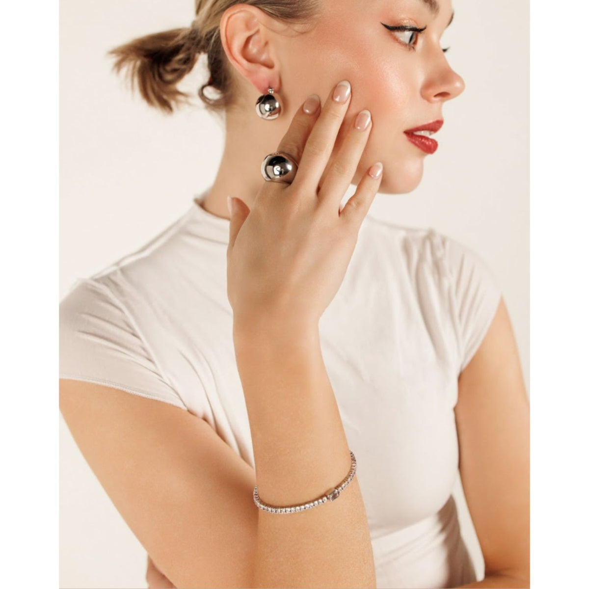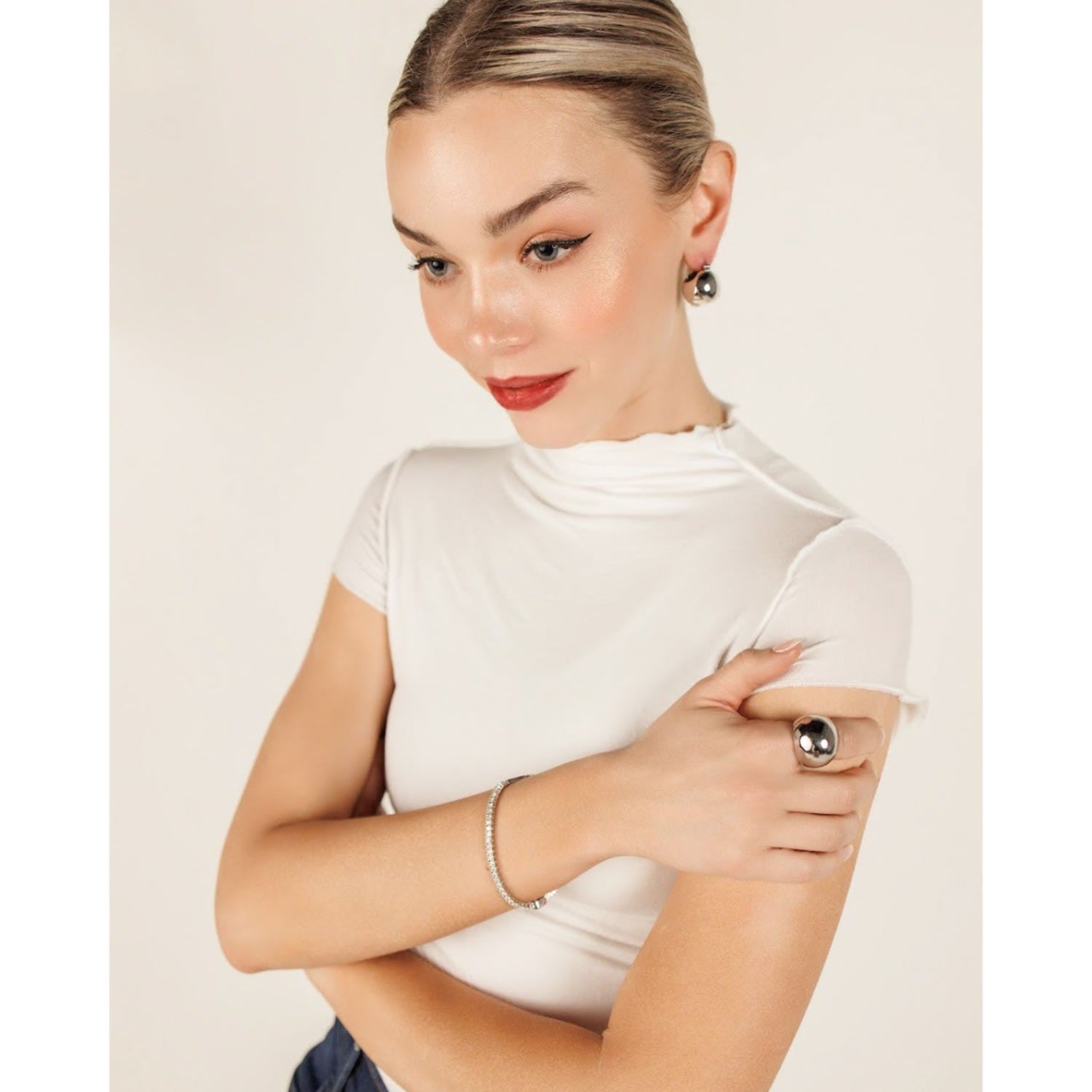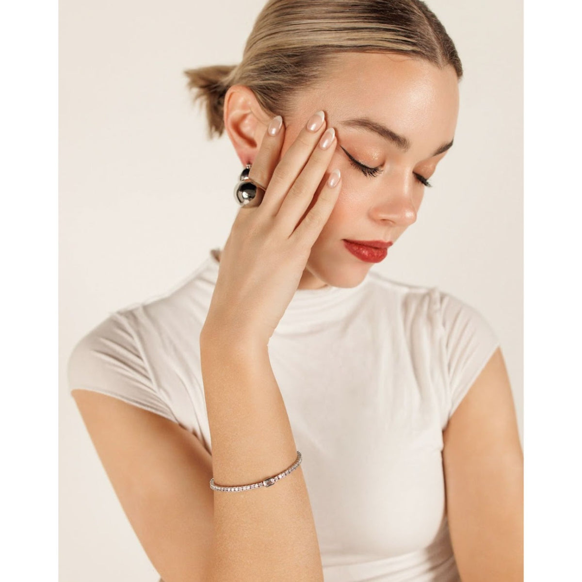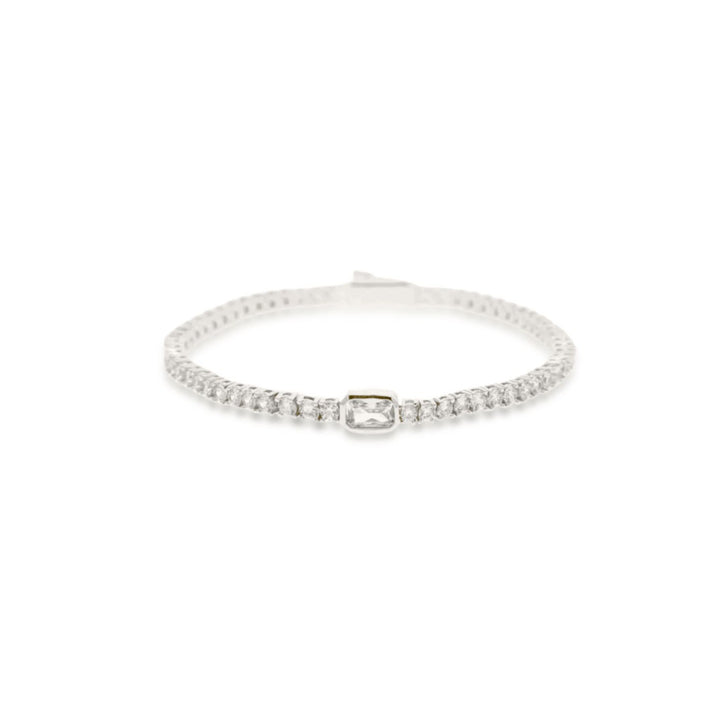 The Malvi Tennis Chain Bracelet by Viea is a stunning accessory that exudes timeless charm and sophistication. It features a mesmerizing array of square cubic zirconia stones, with a slightly larger rectangular centerpiece for a touch of unique sparkle. This bracelet adds shine to a minimalist look or can be styled with other classic pieces for an elegant stack. It’s perfect for those who want to add a touch of refined beauty to their ensemble.